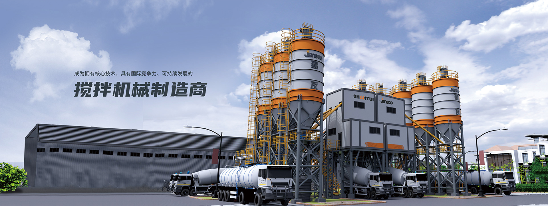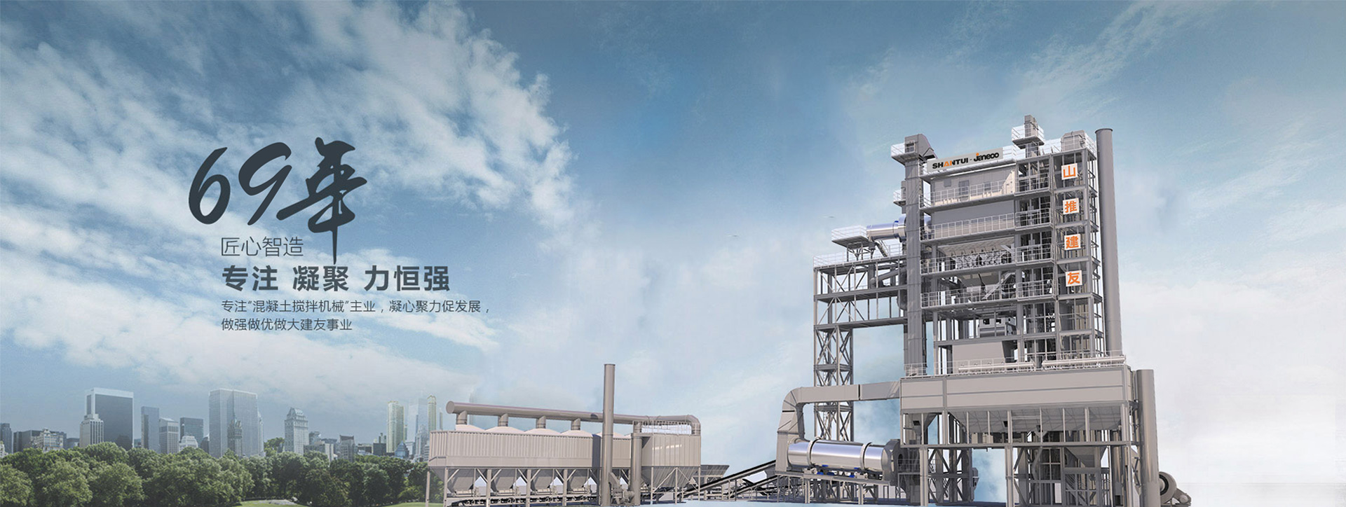山推建友機(jī)械股份有限公司主營混凝土攪拌站、瀝青攪拌站、穩(wěn)定土拌合站、干混砂漿站、制砂站、破碎線、混凝土攪拌運(yùn)輸車、圾處理設(shè)備及拖泵、砂石分離機(jī)等各類攪拌機(jī)械。